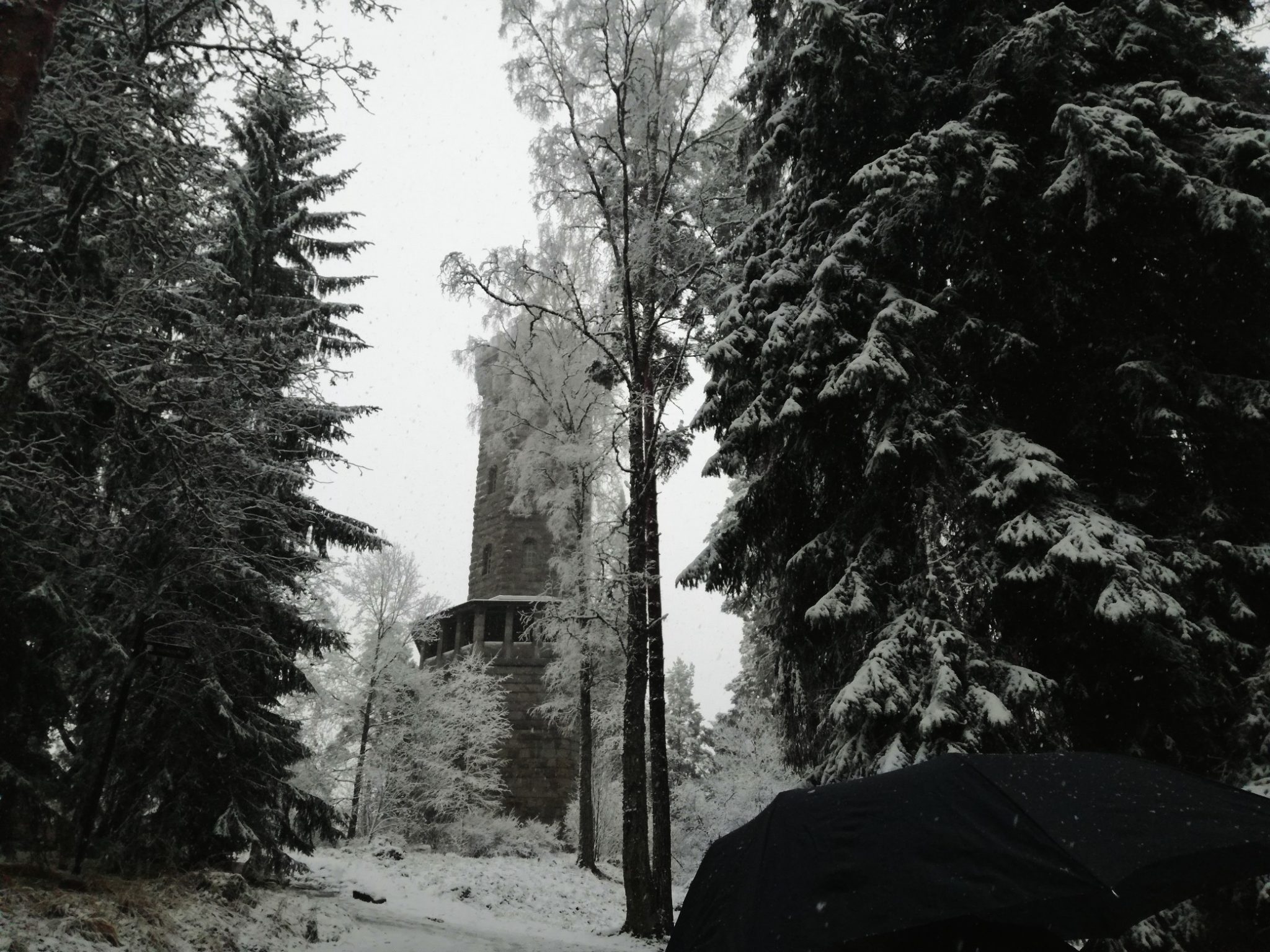Mäen päällä sijaitsikin näkötorni, josta sumuisassa säässä ei paljoa nähnyt. Tornin portaat ovat kiviset ja erityisesti talvella hyvin liukkaat, joka lisäsi jännitystä. Onneksi ylös on vain muutama hassu porras, joten torniin pääsi vaivatta. Suurempi haaste olikin, kun päätimme laskeutua alas tornista näköalapaikan läheltä lähteviä portaita. Kylmä sää, loska ja jää tekivät näistä portaista todella hermostuttavat, joten huonoilla kengillä ei portaisiin välttämättä kannata lähteä, ellei ole varma, että pääsee hengissä maahan saakka. Pohjalla voi kuitenkin kohdata hienon karhu patsaan, jonka takana voi kuunnella äänten kaikumista.