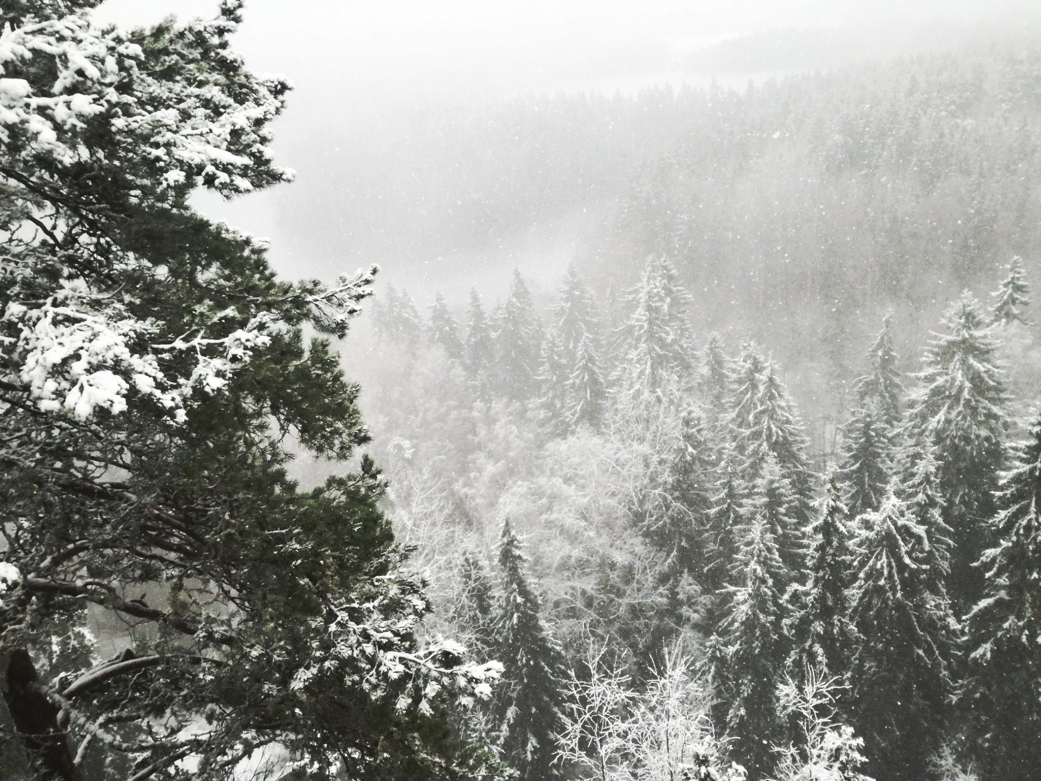 Matka ylös oli loskan vuoksi liukas, joten matka taittui varovasti. Lopulta pääsimme ylös ja tietenkin viewpointilla täytyi ottaa kuvia avautuvasta maisemasta. Kännykän kamera yllätti laadullaan positiivisesti ja kuvista tulikin omasta mielestäni lähes järkkärin veroisia. Kylmä sää, sumu ja lumisade teki maisemasta lähes runollisen ja se aukesikin alas kauniisti. Hiljaisuuden vallitessa pystyi vain ihastelemaan luonnon kauneutta.